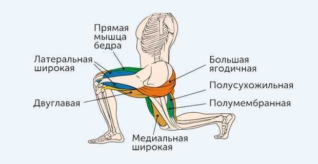 - в нижней части тела — ягодичные мышцы и квадрицепсы;